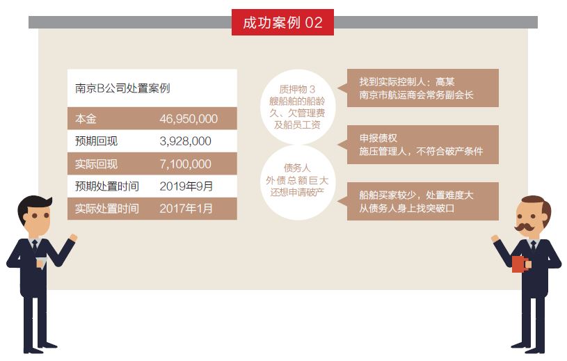 上述兩戶債務人均為同一實際控制人。該實際控制人 在公司經營陷入困境、現金流周轉困難之后已將公司大部 分資產轉移。同時,該實際控制人認為我方無法找到并控 制抵押物船舶,一開始并不配合。