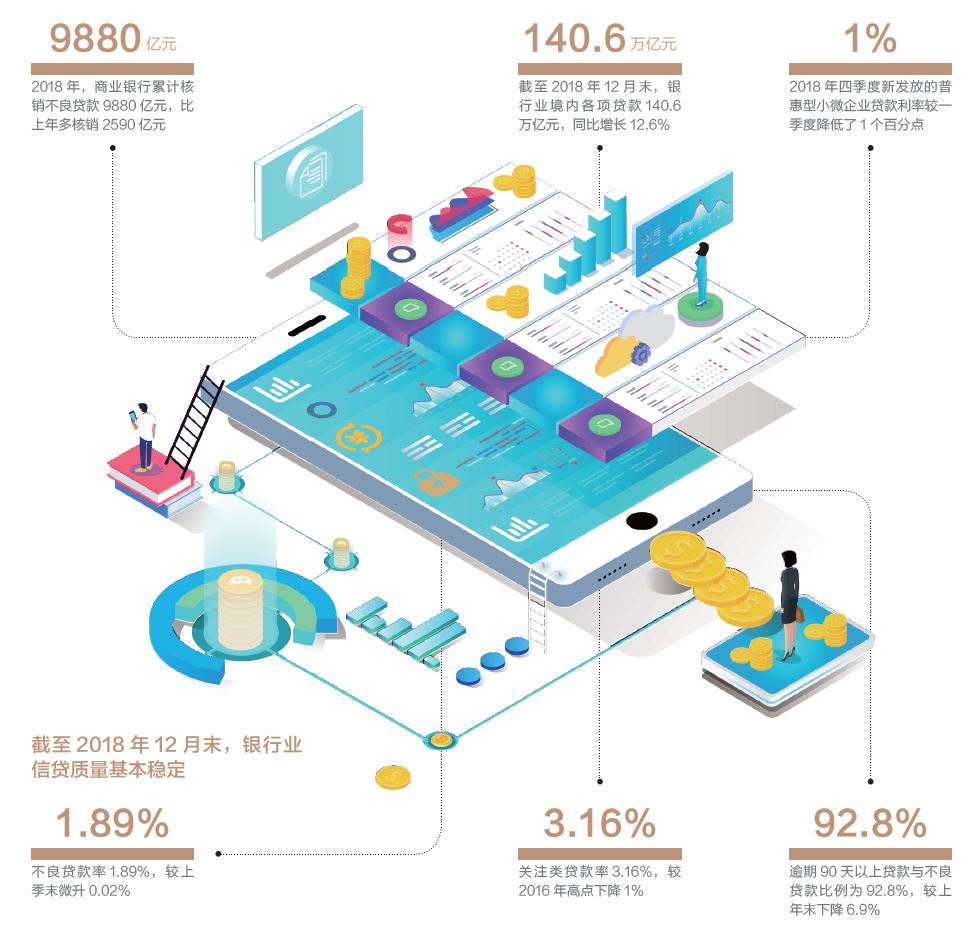 從整體上看,根據(jù)銀保監(jiān)會(huì)目前的不完全初步統(tǒng)計(jì),2018年全年,我國(guó)商業(yè)銀行共處置不良資產(chǎn)近 2 萬億元,而 2017 年的數(shù)據(jù)是 1.4 萬億元。 值得注意的是,通過核銷等措施,更多的信貸空間得以釋放,并以更廣的覆蓋面、更低的價(jià)格流向小微企業(yè)等普惠領(lǐng)域。據(jù)統(tǒng)計(jì),截至 2018 年 12 月末,銀行業(yè)境內(nèi)各項(xiàng)貸款140.6萬億元,同比增長(zhǎng)12.6%,這一增速為近年來較高水平;2018年四季度新發(fā)放的普惠型小微企業(yè)貸款利率較一季度降低了超過 1 個(gè)百分點(diǎn)。