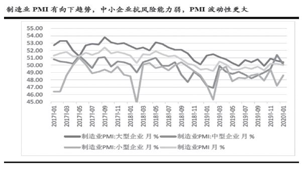 最近公布的 2020 年 1 月制造業 PMI 指數為 50,較上月小幅下行,但考慮制造業生產受春節假期影響,出現回落,屬于正?,F象,本月制造業 PMI 指數能維持在 50 的分水嶺,說明經濟韌性相對較強。需要重點注意的是, 從過往 PMI 的細分數據看,我國中小企業的 PMI 數據長期低于大企業,且低于 50 的臨界線。